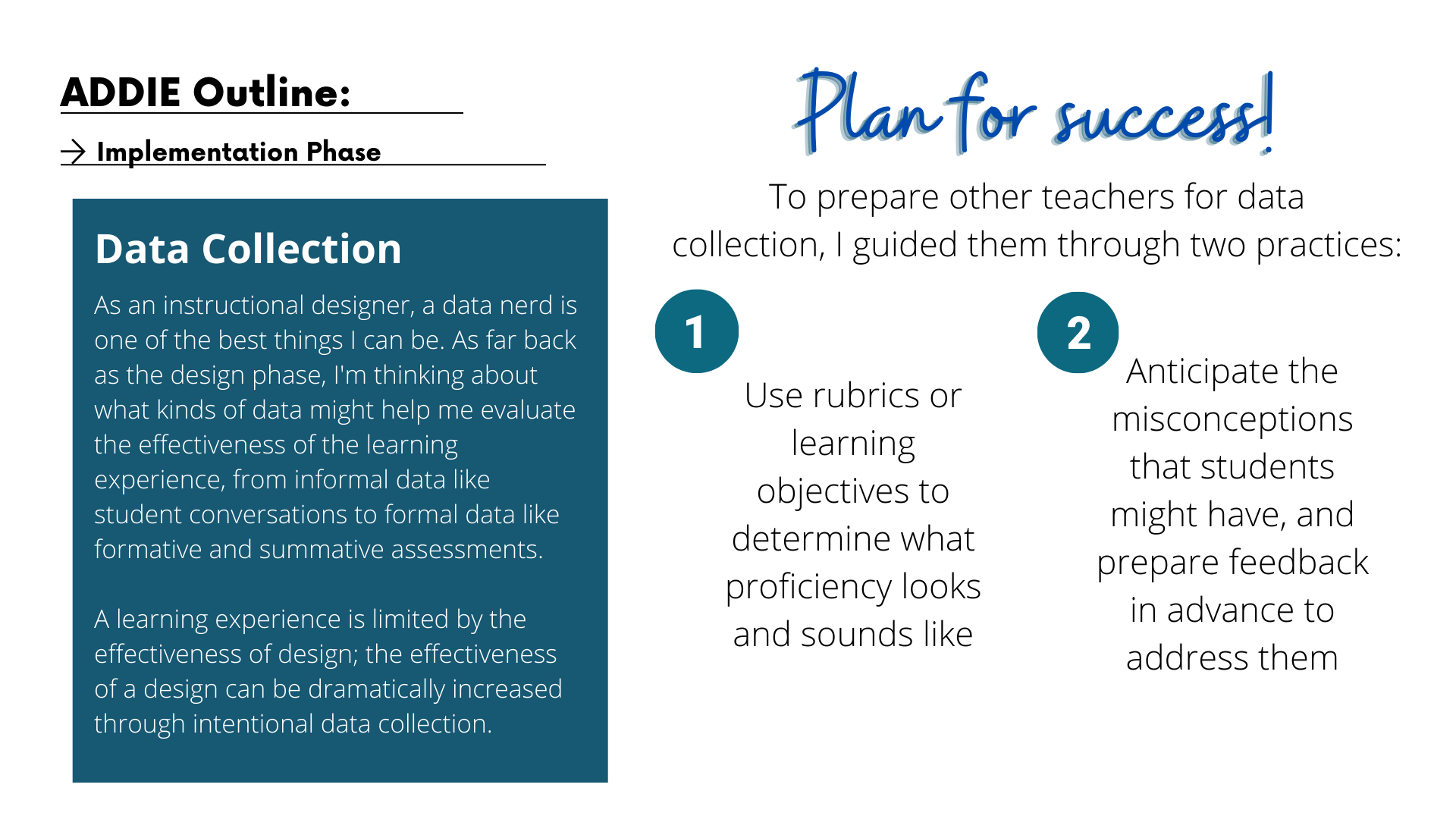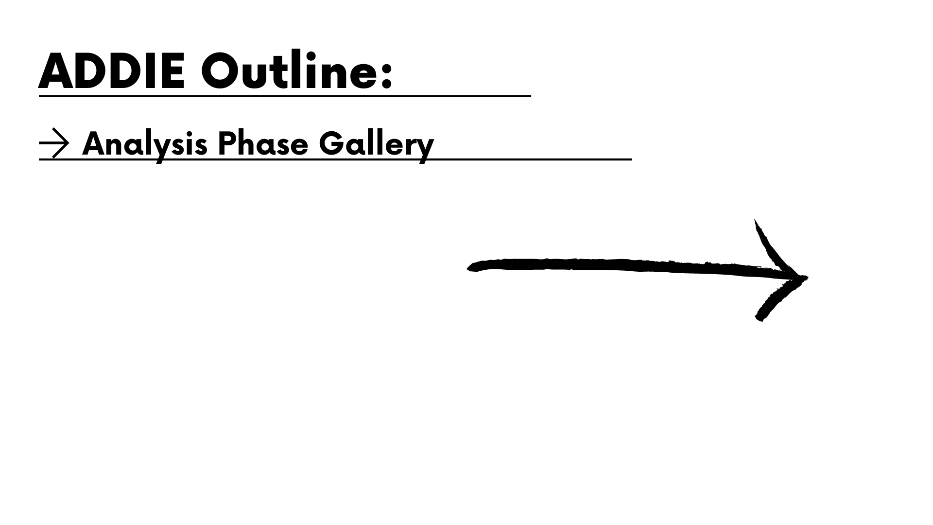 This artifact is organized by the ADDIE model of instructional design. Each ADDIE phase has its own gallery, and you can click the arrow on the right of the screen to explore each part of that phase. When you are ready to move on, scroll down to the next phase.